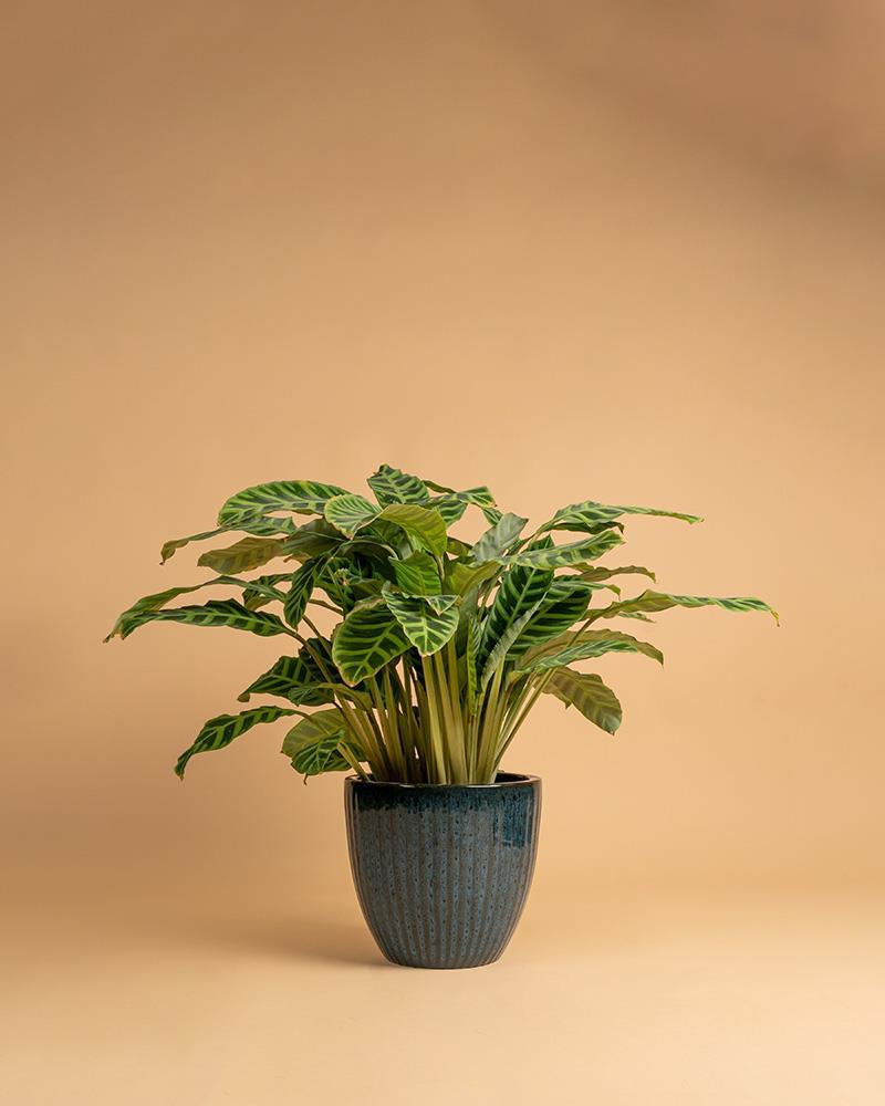 Esta Calathea é uma das mais apreciadas pelas suas folhas singulares de toque aveludado e padrão marcante de listras verdes escuras sobre um fundo verde claro, lembrando o padrão de uma zebra.