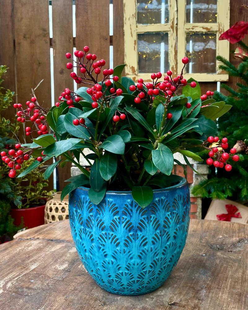 A Skimmia japonica ‘Beautiful’ é um arbusto perene de folhas verdes escuras e brilhantes, que contrastam com as bagas vermelhas que produz durante os meses mais frios.